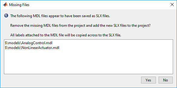 Диалоговое окно Missing Files предлагает удалять пропавших без вести файл MDL из проекта и добавлять новый файл SLX в проект.