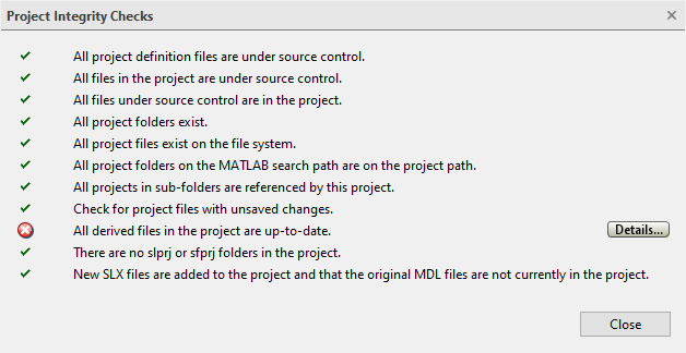 Чтобы решить эти вопросы, на вкладке Project, нажимают Run Checks> Check Project, чтобы запустить проверки целостности проекта. Проверки ищут файлы MDL, преобразованные в SLX, и предлагают автоматические меры, если та проверка перестала работать. Нажмите кнопку Fix, чтобы просмотреть рекомендуемый действия и решить, внести ли изменения.