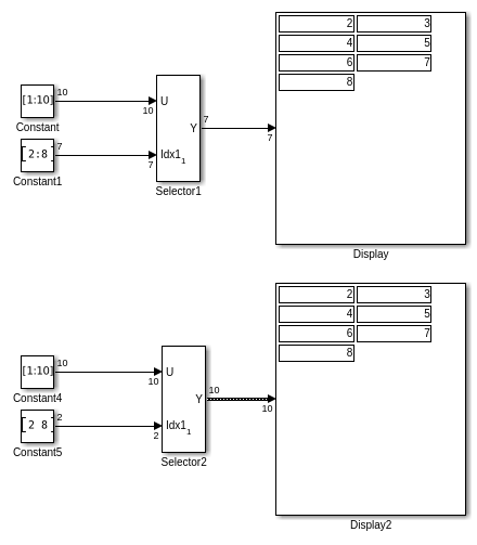Блок Selector генерирует, как выведено выбрано или переупорядочено элементы входного вектора, матрицы или многомерного сигнала.