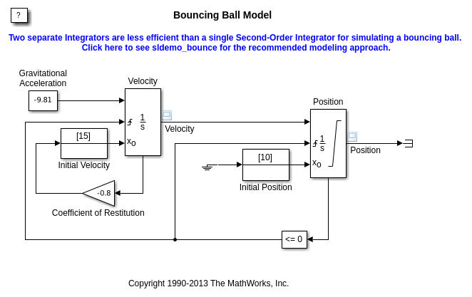 Можно использовать два блока Интегратора, чтобы смоделировать прыгающий мяч. Интегратор слева является скоростным интегратором, моделируя первое уравнение, и Интегратор справа является интегратором положения. Перейдите к интегратору положения, блокируют диалоговое окно и замечают, что это имеет нижний предел нуля. Это условие представляет ограничение, что шар не может понизиться земля.