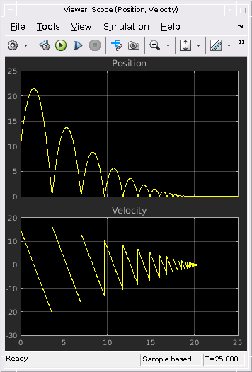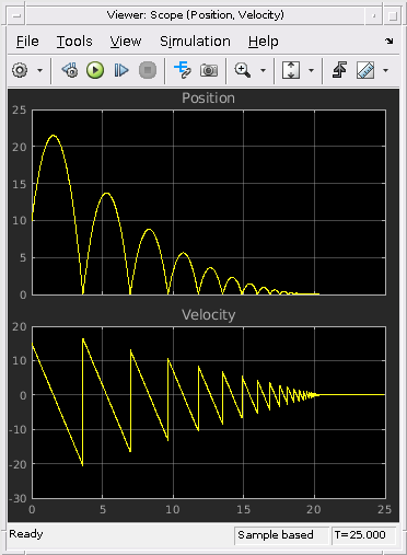 Порт состояния интегратора положения и соответствующего результата сравнения используется, чтобы обнаружить, когда мяч попадает в землю и сбрасывать оба интегратора. Порт состояния скоростного интегратора используется в вычислении