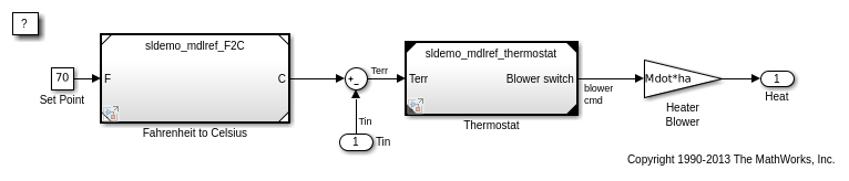 Блок Model это ссылается на sldemo_mdlref_F2C в sldemo_mdlref_heater имеет белые углы, в то время как блок Model это ссылается на sldemo_mdlref_F2C в sldemo_mdlref_outdoor_temp имеет серые углы. Это вызвано тем, что Видимость Режима normal mode блока Model включена для блока Model в sldemo_mdlref_heater но не включено для блока Model в sldemo_mdlref_outdoor_temp. Обратите внимание на то, что только один экземпляр Режима normal mode каждой модели будет иметь белые углы, у остальных будут серые углы. Отобразите блоки (например, Осциллографы) покажет данные для экземпляра, на который ссылаются от блока Model с белыми углами, в этом случае из модели sldemo_mdlref_heater, но не для любого другого экземпляра: