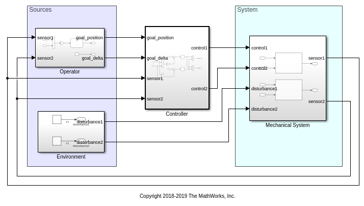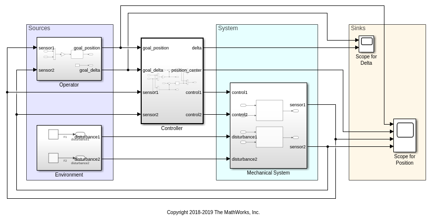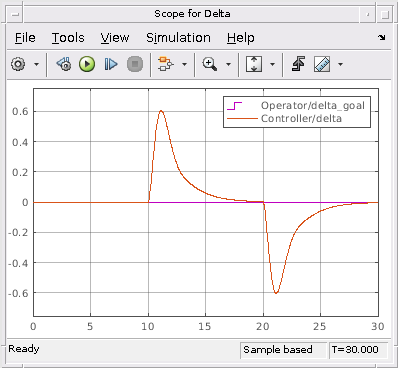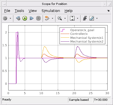 Результаты симуляции остаются то же самое после того, как сигналы будут сгруппированы в шинах. Этот пример включает регистрацию данных для сигнальных линий, сопоставленных с шинами x_sensor и goal вместо того, чтобы регистрировать данные индивидуально для каждого из сигналов в этих шинах.