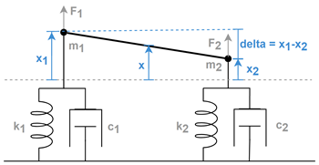 Чтобы продемонстрировать, как уменьшать помеху сигнальной линии, этот пример реализует модель с несколькими датчиками и приводами. Система имеет две пружины, демпферы и массы. Луч соединяет эти две массы, как показано в этом изображении.