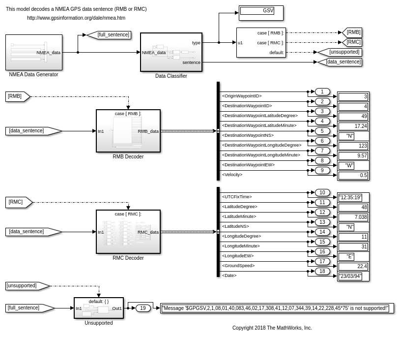 В этом примере показано, как проанализировать текстовые сообщения в формате GPS NMEA с помощью блоков строки Simulink®.