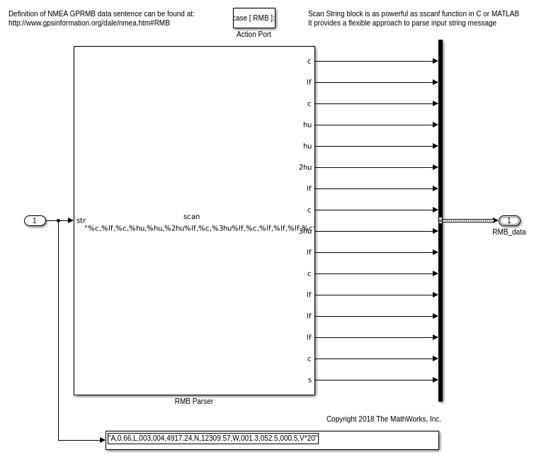 Эта модель показывает, как использовать тип данных String и блоки, обеспеченные Simulink®, чтобы считать входные текстовые сообщения и извлечь числовой и текстовые данные.