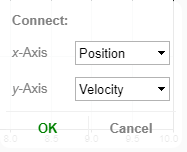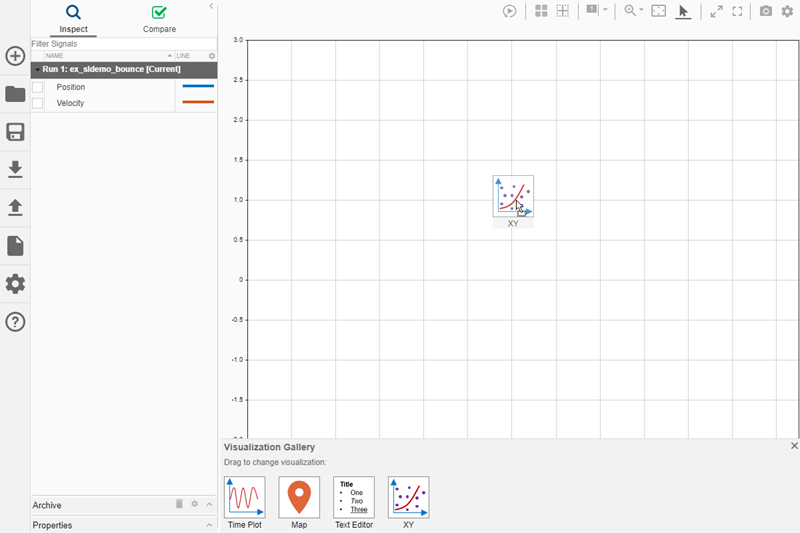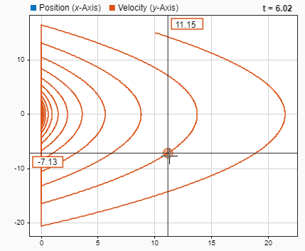 Чтобы построить сигналы на визуализации XY, перетащите мышью оба сигнала на график. Можно задать, какой сигнал использовать в качестве x данных и чтобы использовать в качестве y данных. В данном примере используйте Position как x данные и Velocity для y данных.