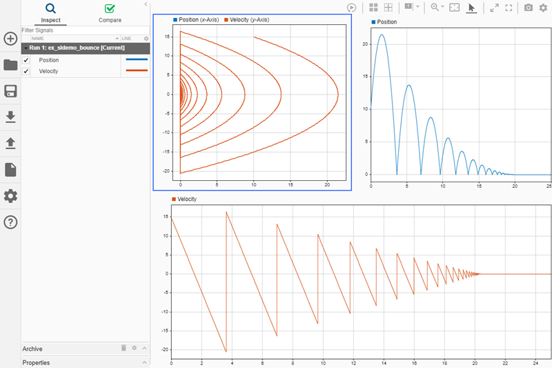 Модель в этом примере симулирует динамику прыгающего мяча, регистрируя скорость и положение шара как выходные параметры.