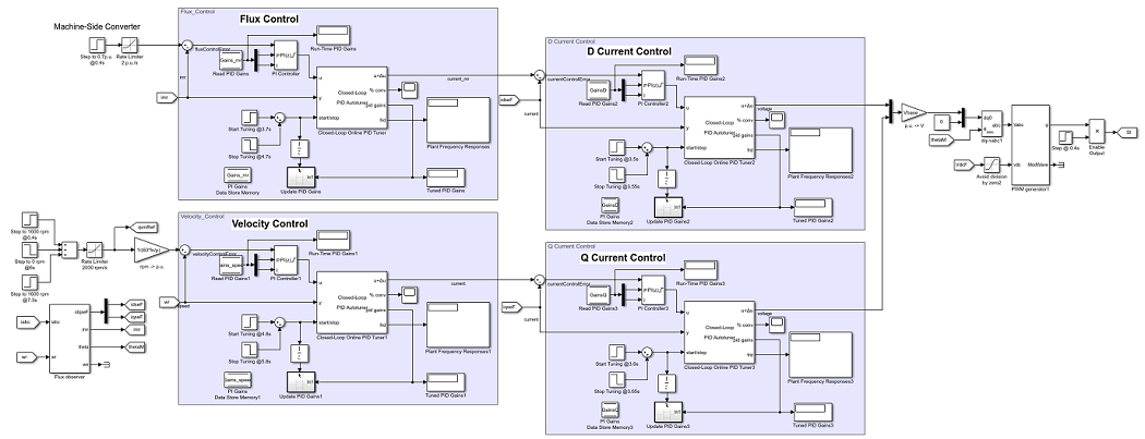 Чтобы изменить управляющую структуру, включите Блок Автотюнера ПИДа С обратной связью к каждому из ПИ-контроллеров. Просмотрите модифицированную управляющую структуру для конвертера машины стороны.