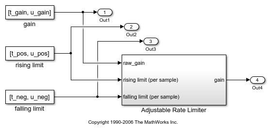 Входные параметры производятся с помощью три Из блоков Рабочей области: получите, возрастающий предел и падающий предел. Значения входных параметров заданы шестью переменными, заданными в рабочей области MATLAB®: t_gain, u_gain, t_pos, u_pos, t_neg, и u_neg.