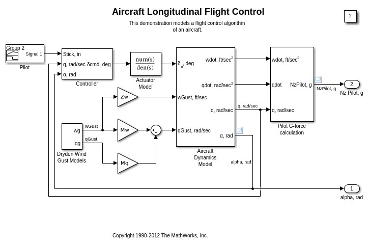 Модель Simulink, sdoAircraftEstimation, моделирует продольную систему управления полетом самолета.