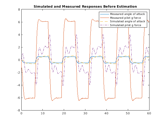plot(time, iodata, ... AoASignal.Values.Time,AoASignal.Values.Data,'--', ... PilotGSignal.Values.Time,PilotGSignal.Values.Data,'-.'); title('Simulated and Measured Responses Before Estimation') legend('Measured angle of attack', 'Measured pilot g force', ... 'Simulated angle of attack', 'Simulated pilot g force');
