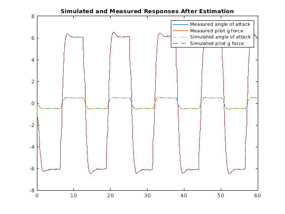 Simulator = createSimulator(Exp,Simulator); Simulator = sim(Simulator); SimLog = find(Simulator.LoggedData,get_param('sdoAircraftEstimation','SignalLoggingName')); PilotGSignal = find(SimLog,'PilotG'); AoASignal = find(SimLog,'AngleOfAttack'); plot(time, iodata, ... AoASignal.Values.Time,AoASignal.Values.Data,'-.', ... PilotGSignal.Values.Time,PilotGSignal.Values.Data,'--') title('Simulated and Measured Responses After Estimation') legend('Measured angle of attack', 'Measured pilot g force', ... 'Simulated angle of attack', 'Simulated pilot g force');