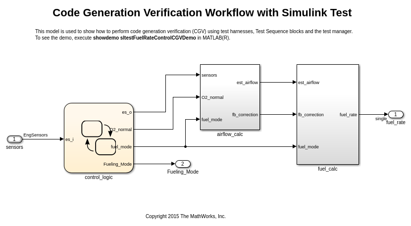 Как часть верификации генерации кода (CGV) для системы контроллера, важно утверждать, что функциональное поведение контроллера - то же самое во время нормального и программного обеспечения в цикле (SIL) режимы симуляции. Менеджер по тесту используется, чтобы выполнить эту верификацию.