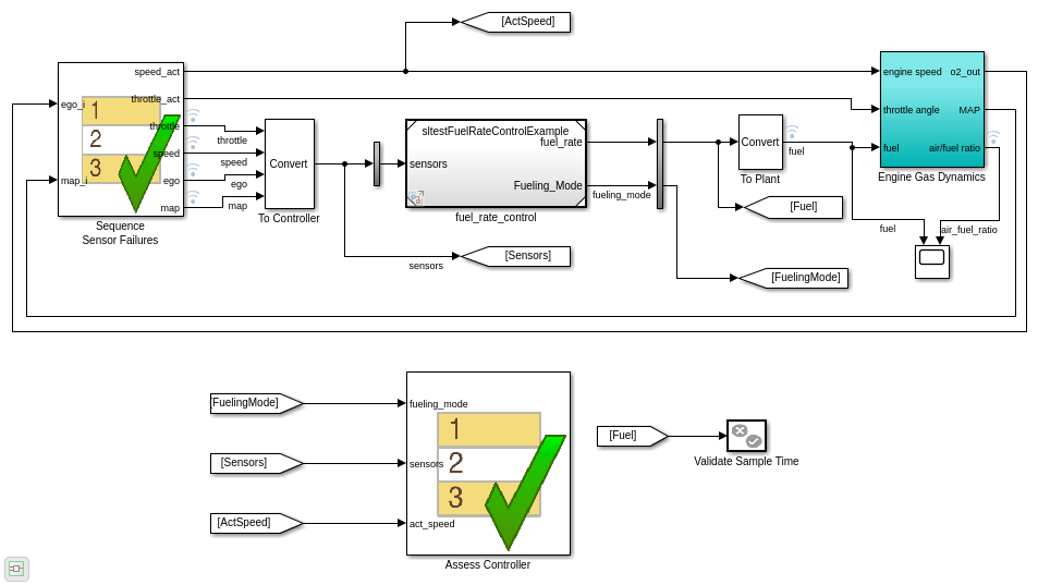 Тестовая обвязка была смоделирована как тест с обратной связью с блоком Test Sequence, чтобы управлять топливным контроллером скорости. Вычисленный fuel_rate от выхода контроллера используется, чтобы управлять моделью бензинового двигателя. Топливный уровень объединяется с фактическим воздушным потоком в Engine Gas Dynamics подсистема, чтобы определить получившееся отношение смеси, как обнаружено в выхлопе. Обратная связь от кислородного датчика до блока Test Sequence обеспечивает корректировку с обратной связью оценки уровня для того, чтобы обеспечить идеальное отношение смеси.