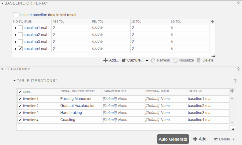 Модель симулирует для всех групп Signal Builder. Базовые данные для output_torque и vehicle_speed получены в четырех файлах MAT. Кроме того, каждый базовый набор данных добавляется к своим соответствующим итерациям в таблице.