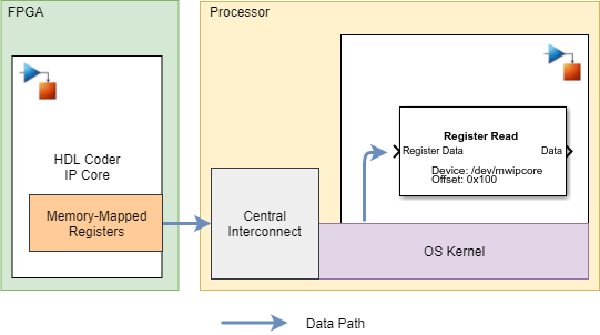 Блок Register Read считывает данные из области регистра на заданном ядре IP. В симуляции управляемая таймером или событийно-управляемая подсистема задачи содержит блок Register Read. Сигналы данных от блока Register Read соединяют с управлением блока Register Channel те регистры и их транзакции.