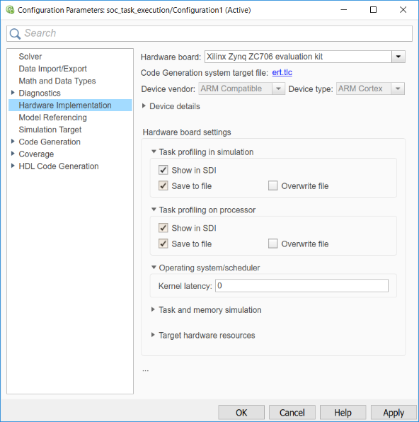 Следующий рисунок показывает параметры SoC, связанные с выполнением задачи в диалоговом окне параметров конфигурации модели. Обратите внимание на то, что профилирование Задачи на телевикторинах процессора, только если вы устанавливаете все необходимые продукты и пакеты аппаратной поддержки.