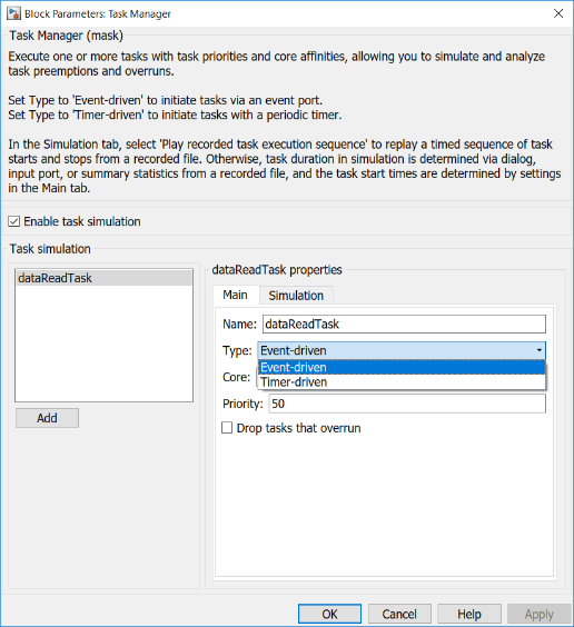 Блок Task Manager позволяет вам конфигурировать выполнение задач в вашей модели. В диалоговом окне блока вы задаете, в каком количестве задач вы нуждаетесь в своей системе с помощью кнопок Add и Delete. На вкладке Main диалогового окна вы устанавливаете основные свойства задачи, в то время как на вкладке Simulation вы устанавливаете свойства задачи симуляции.