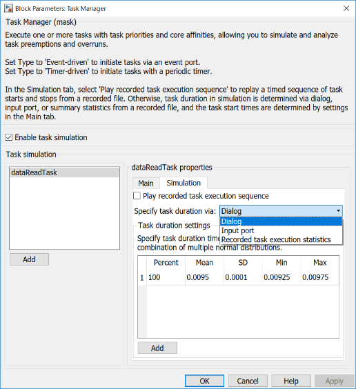 SoC Blockset имеет несколько вариантов для установки длительности задачи. Когда длительность задачи применяется только к симуляции, этот выбор найден во вкладке Simulation диалогового окна Диспетчера задач.