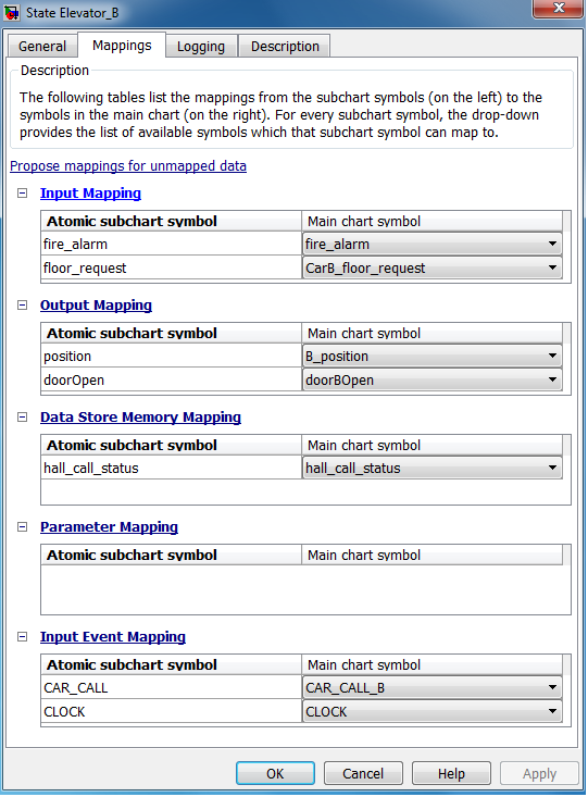 В модели библиотеки, графике Elevator реализует логику для типового автомобиля лифта. Программировать подграфики Elevator_A и Elevator_B так, чтобы они управляли соответствующим автомобилем, вы сопоставляете данные и события в каждом подграфике к соответствующим данным и события в основном графике. Например, для Elevator_B: