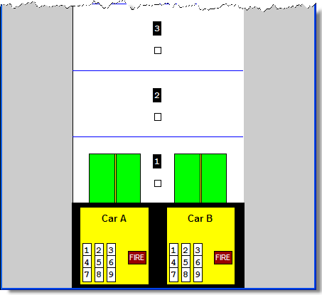 В начале симуляции модель открывает пользовательский интерфейс. Пользовательский интерфейс показывает два автомобиля лифта, которые могут остановиться в девяти этажах. В нижней части пользовательского интерфейса два желтых прямоугольника представляют внутреннюю часть автомобилей лифта. В то время как пример запускается, вы вызываете автомобиль лифта, запрашиваете остановку в полу или выделяете пожарную сигнализацию путем нажатия кнопок на каждой прихожей пола и в автомобилях лифта. Пользовательский интерфейс отвечает путем изменения входных значений и инициирования входных событий для Системного графика Лифта.
