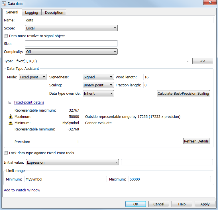 Строка пометила Maximum указывает, что значение, заданное в поле Maximum раздела Limit range, не является представимым типом данных с фиксированной точкой. Чтобы откорректировать ошибку, сделайте одну из этих модификаций, таким образом, тип данных с фиксированной точкой может представлять максимальное значение: