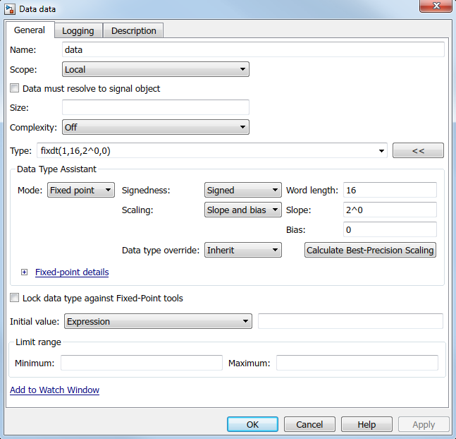 Если вы вводите выражение для типа данных с фиксированной точкой, необходимо задать масштабирование явным образом. Например, вы не можете ввести неполную спецификацию, такую как fixdt(1,16) в поле Type. Если вы не задаете масштабирование явным образом, ошибка появляется, когда вы пытаетесь симулировать свою модель.