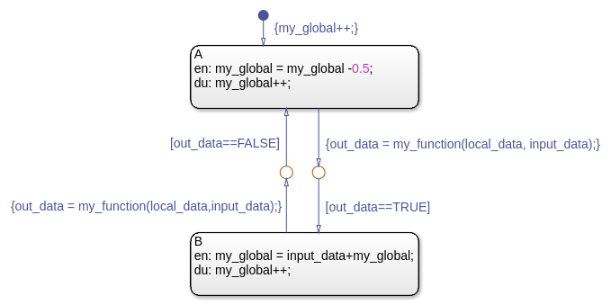 Диаграммы Stateflow вызывают функции пользовательского кода при помощи того же синтаксиса как другие допускающие повторное использование функции:
