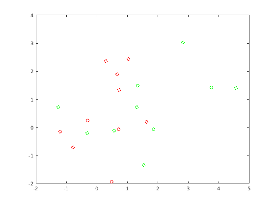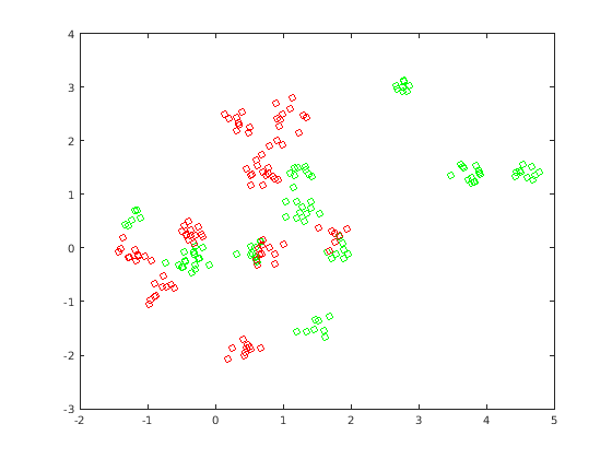 redpts = zeros(100,2);grnpts = redpts; for i = 1:100 grnpts(i,:) = mvnrnd(grnpop(randi(10),:),eye(2)*0.02); redpts(i,:) = mvnrnd(redpop(randi(10),:),eye(2)*0.02); end