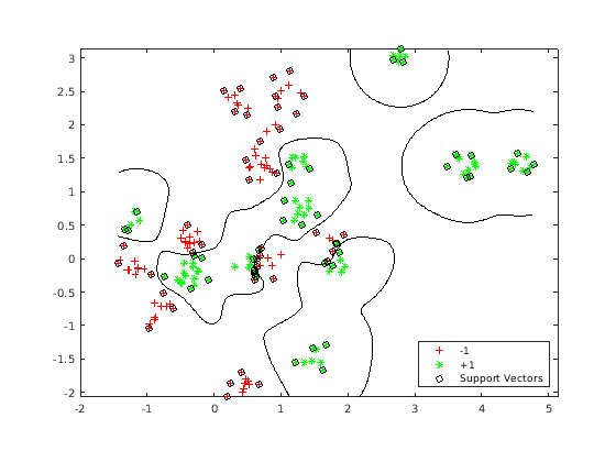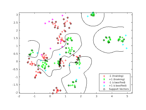 grnobj = gmdistribution(grnpop,.2*eye(2)); redobj = gmdistribution(redpop,.2*eye(2)); newData = random(grnobj,10); newData = [newData;random(redobj,10)]; grpData = ones(20,1); grpData(11:20) = -1; % red = -1 v = predict(SVMModel,newData); g = nan(7,1); figure; h(1:2) = gscatter(cdata(:,1),cdata(:,2),grp,'rg','+*'); hold on h(3:4) = gscatter(newData(:,1),newData(:,2),v,'mc','**'); h(5) = plot(cdata(SVMModel.IsSupportVector,1),... cdata(SVMModel.IsSupportVector,2),'ko'); contour(x1Grid,x2Grid,reshape(scores(:,2),size(x1Grid)),[0 0],'k'); legend(h(1:5),{'-1 (training)','+1 (training)','-1 (classified)',... '+1 (classified)','Support Vectors'},'Location','Southeast'); axis equal hold off
