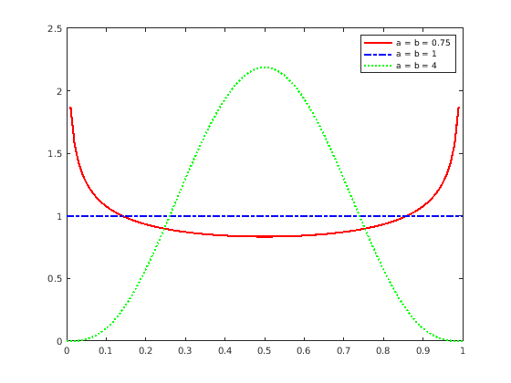 X = 0:.01:1; y1 = betapdf(X,0.75,0.75); y2 = betapdf(X,1,1); y3 = betapdf(X,4,4); figure plot(X,y1,'Color','r','LineWidth',2) hold on plot(X,y2,'LineStyle','-.','Color','b','LineWidth',2) plot(X,y3,'LineStyle',':','Color','g','LineWidth',2) legend({'a = b = 0.75','a = b = 1','a = b = 4'},'Location','NorthEast'); hold off
