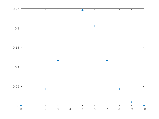 Следующие команды генерируют график биномиального PDF для n = 10 и p = 1/2.