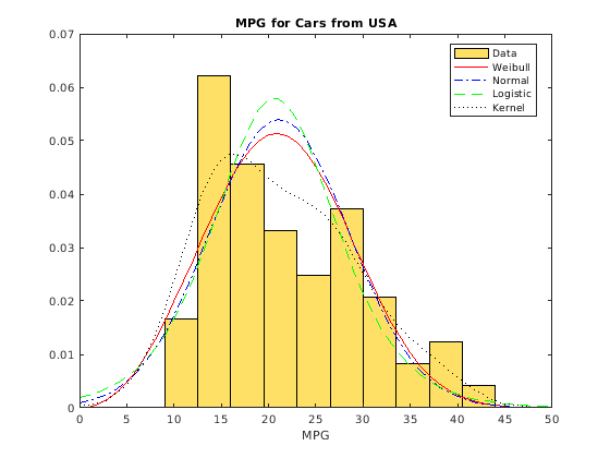 line(x,pdf_Wei,'LineStyle','-','Color','r') line(x,pdf_Norm,'LineStyle','-.','Color','b') line(x,pdf_Log,'LineStyle','--','Color','g') line(x,pdf_Ker,'LineStyle',':','Color','k') legend('Data','Weibull','Normal','Logistic','Kernel','Location','Best') title('MPG for Cars from USA') xlabel('MPG')