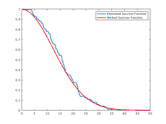stairs(H(:,1),exp(-H(:,2)),'LineWidth',2) xx = linspace(0,100); line(xx,1-wblcdf(xx,50*exp(-0.5*mean(X)),B),'color','r','LineWidth',2) xlim([0,50]) legend('Estimated Survivor Function','Weibull Survivor Function')