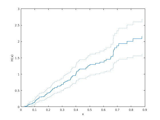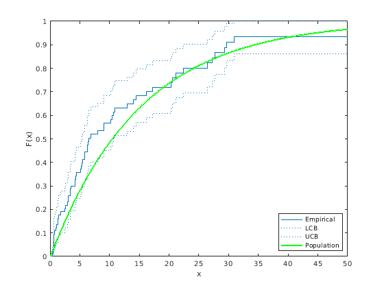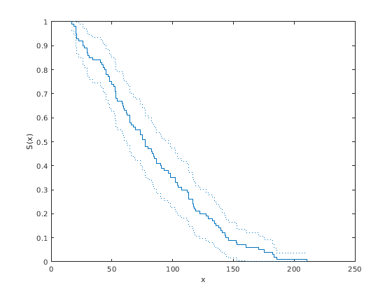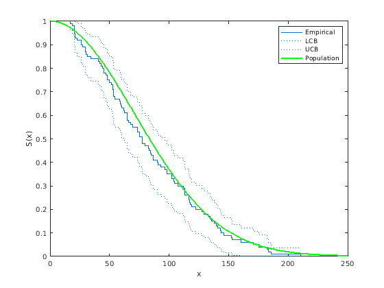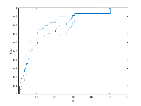 ecdf вычисляет доверительные границы с помощью формулы Гринвуда. Они не одновременные доверительные границы.