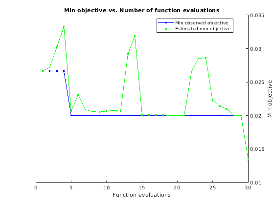 Для воспроизводимости, набор случайный seed и использование 'expected-improvement-plus' функция приобретения.