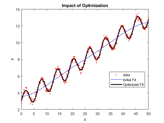 figure(); plot(x,y,'r.'); hold on plot(x,ypred1,'b'); plot(x,ypred2,'g'); xlabel('x'); ylabel('y'); legend({'data','default kernel parameters',... 'kparams0 = [3.5,6.2], sigma0 = 0.2'},... 'Location','Best'); title('Impact of initial kernel parameter values'); hold off