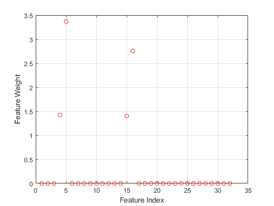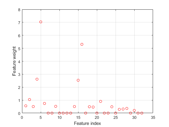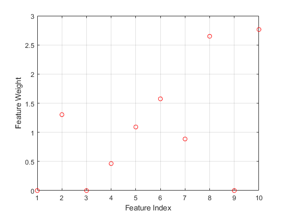 figure() plot(mdl.FeatureWeights,'ro') grid on xlabel('Feature index') ylabel('Feature weight')