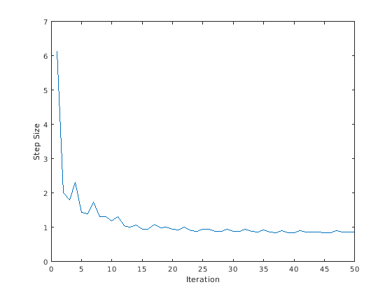 figure; plot(info.StepSizeTuningInfo.StepSizeProfile); xlabel('Iteration'); ylabel('Step Size');