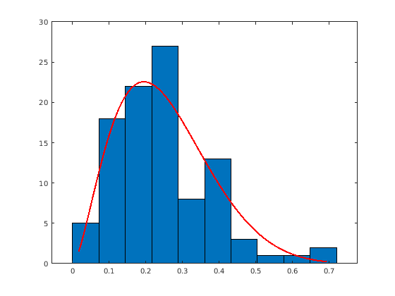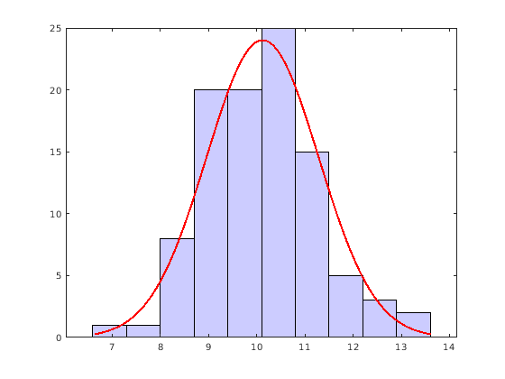 histfit( строит гистограмму значений в data)data использование количества интервалов равняется квадратному корню из числа элементов в data и соответствует нормальной функции плотности.