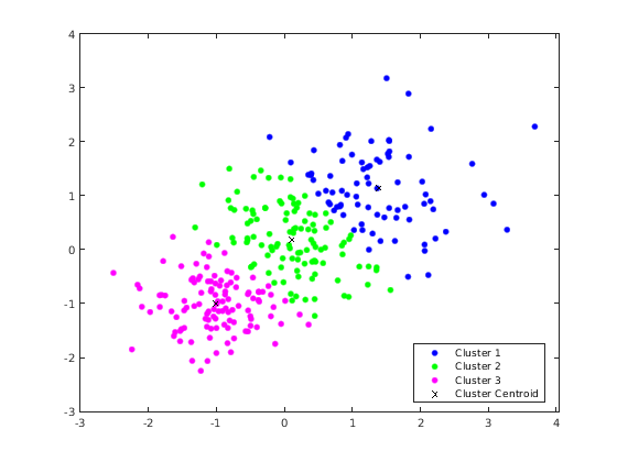 figure gscatter(X(:,1),X(:,2),idx,'bgm') hold on plot(C(:,1),C(:,2),'kx') legend('Cluster 1','Cluster 2','Cluster 3','Cluster Centroid')