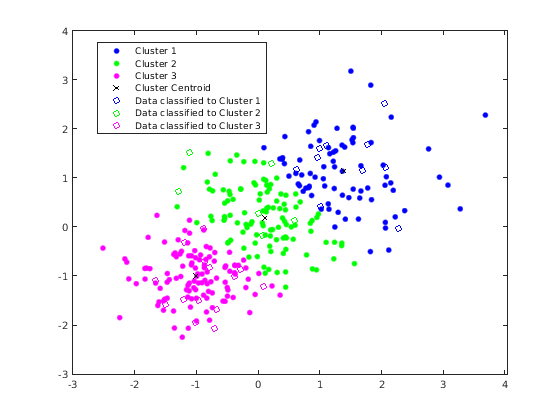 gscatter(Xtest(:,1),Xtest(:,2),idx_test,'bgm','ooo') legend('Cluster 1','Cluster 2','Cluster 3','Cluster Centroid', ... 'Data classified to Cluster 1','Data classified to Cluster 2', ... 'Data classified to Cluster 3')