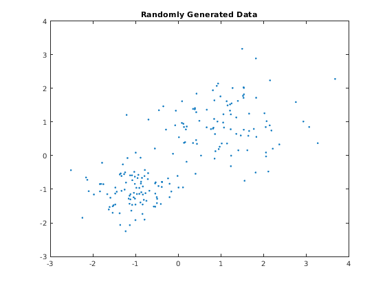 rng default; % For reproducibility X = [randn(100,2)*0.75+ones(100,2); randn(100,2)*0.5-ones(100,2)]; figure; plot(X(:,1),X(:,2),'.'); title 'Randomly Generated Data';