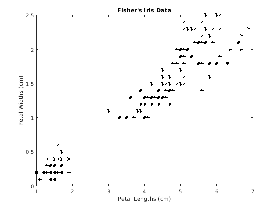 load fisheriris X = meas(:,3:4); figure; plot(X(:,1),X(:,2),'k*','MarkerSize',5); title 'Fisher''s Iris Data'; xlabel 'Petal Lengths (cm)'; ylabel 'Petal Widths (cm)';