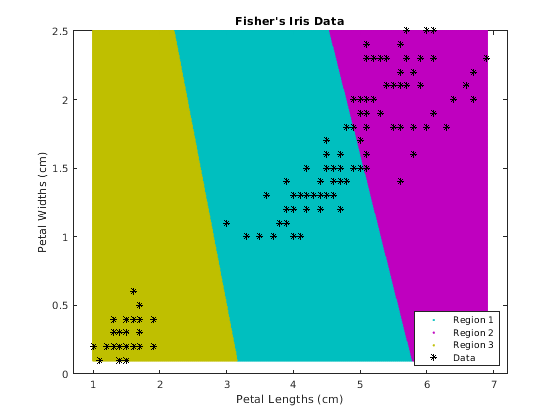 figure; gscatter(XGrid(:,1),XGrid(:,2),idx2Region,... [0,0.75,0.75;0.75,0,0.75;0.75,0.75,0],'..'); hold on; plot(X(:,1),X(:,2),'k*','MarkerSize',5); title 'Fisher''s Iris Data'; xlabel 'Petal Lengths (cm)'; ylabel 'Petal Widths (cm)'; legend('Region 1','Region 2','Region 3','Data','Location','SouthEast'); hold off;
