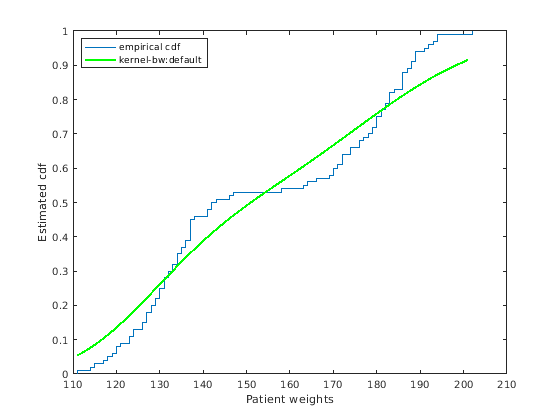 pts = (min(hospital.Weight):2:max(hospital.Weight)); figure() ecdf(hospital.Weight) hold on [f,xi,bw] = ksdensity(hospital.Weight,pts,'Support','positive',... 'Function','cdf'); plot(xi,f,'-g','LineWidth',2) legend('empirical cdf','kernel-bw:default','Location','northwest') xlabel('Patient weights') ylabel('Estimated cdf')