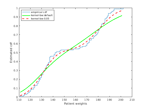[f,xi] = ksdensity(hospital.Weight,pts,'Support','positive',... 'Function','cdf','Bandwidth',0.05); plot(xi,f,'--r','LineWidth',2) legend('empirical cdf','kernel-bw:default','kernel-bw:0.05',... 'Location','northwest') hold off