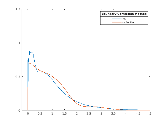 pts = linspace(0,5,1000); % points to evaluate the estimator [f1,xi1] = ksdensity(x,pts,'Support','positive'); [f2,xi2] = ksdensity(x,pts,'Support','positive','BoundaryCorrection','reflection');