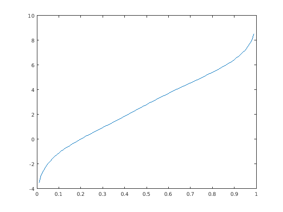 rng('default') % For reproducibility x = [randn(30,1); 5+randn(30,1)]; pi = linspace(.01,.99,99); figure ksdensity(x,pi,'Function','icdf');